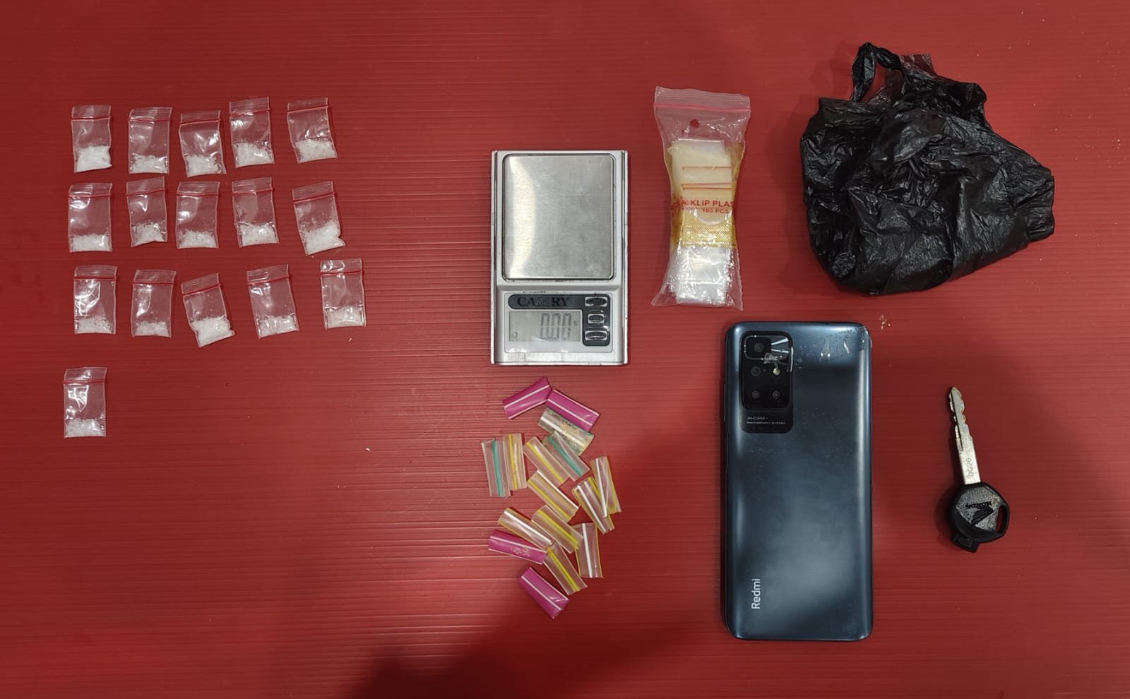 Dari hasil penggeledahan, ditemukan sejumlah barang bukti yang diduga kuat berkaitan dengan tindak pidana narkotika. Di antaranya 16 paket kecil sabu siap edar, sejumlah potongan sedotan berbagai warna yang diduga digunakan sebagai alat bantu, satu ball plastik klip bening, satu plastik asoy warna hitam, satu unit handphone merek Redmi, serta satu unit timbangan digital merek Camry.